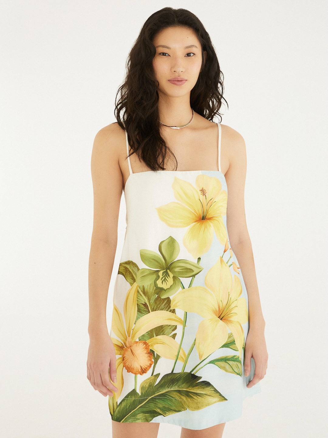 O Vestido Floral Samanta da Farm possui alças finas e decote reto que trazem um toque casual ao modelo. A cintura é valorizada com um laço nas costas, adicionando charme e originalidade. A peça é ideal para eventos ao ar livre e passeios ao pôr do sol. Esta é uma peça Farm Rio Original - Inverno 26!