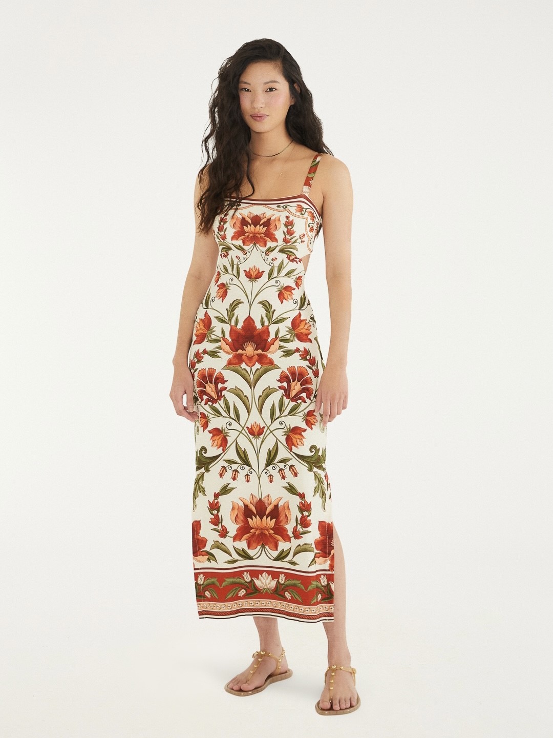 O Vestido Natália da Farm possui alças finas ajustáveis e decote reto, conferindo um toque especial à peça. O corte midi e a fenda lateral garantem um visual casual ideal para um almoço ao ar livre ou um passeio na praia. É confeccionado em tecido leve e fluido que proporciona conforto em qualquer ocasião. Esta é uma peça Farm Rio Original - Alto Verão 26!