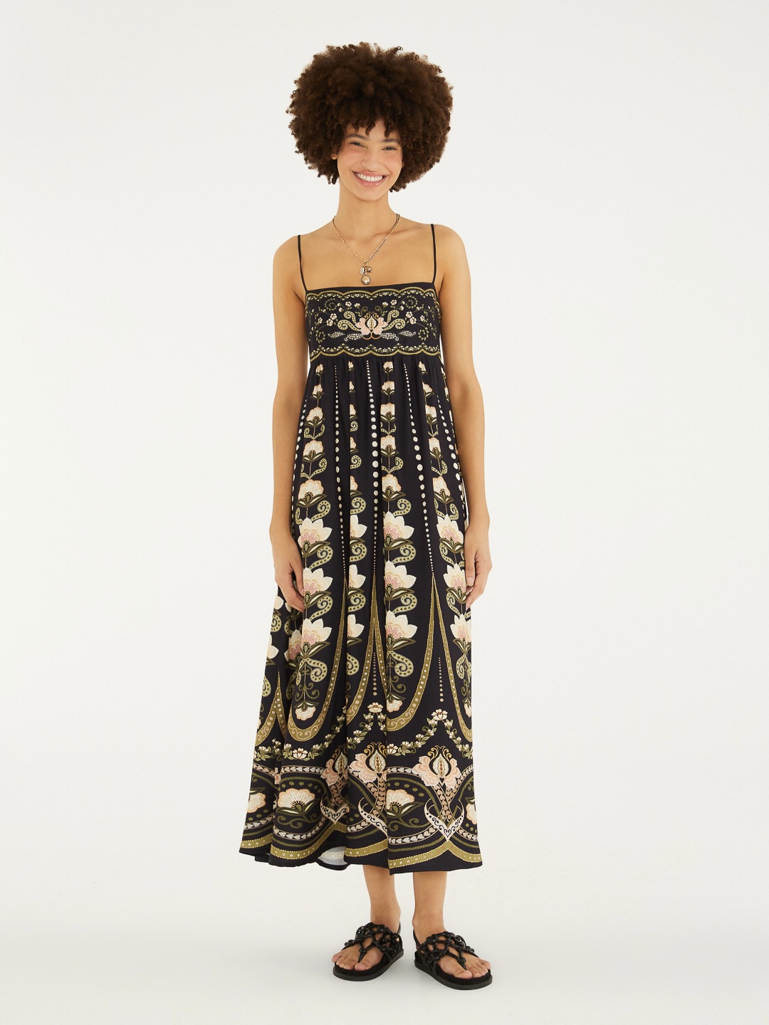 O Vestido Nikita da Farm traz encanto com suas alças finas e decote reto, proporcionando uma modelagem fluida e confortável. É rico em detalhes, o que complementa o design e o torna perfeito para eventos especiais ou um passeio casual. É uma peça versátil que conecta tradição e modernidade. Esta é uma peça Farm Rio Original - Inverno 26!