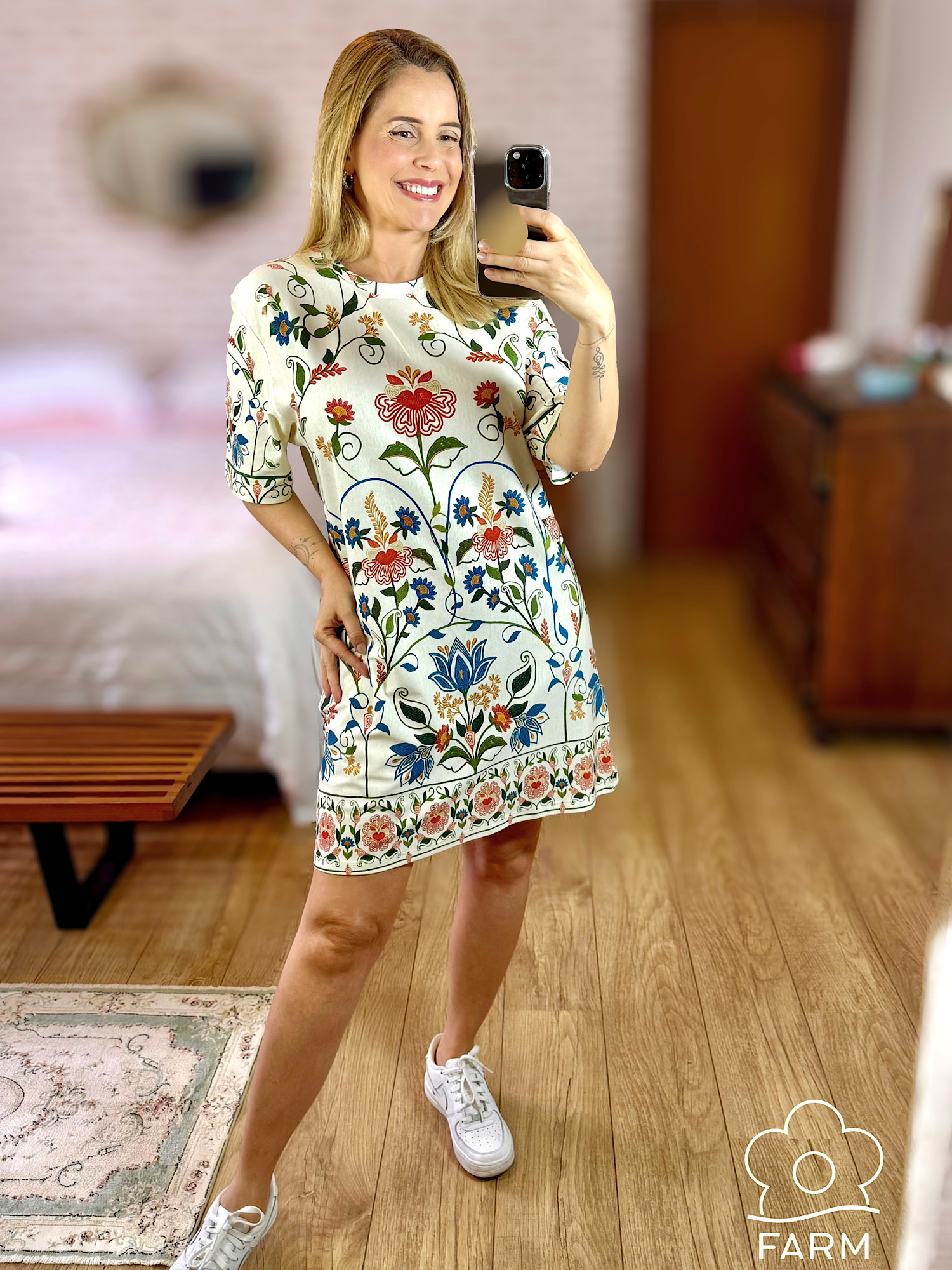 O Vestido T-Shirt Jardim Beleza da Farm possui gola redonda e mangas curtas que oferecem um toque casual à peça, encantando pela estampa exclusiva. O corte reto proporciona liberdade de movimento, ideal para passeios ao ar livre ou encontros informais. A peça é um convite ao conforto com estilo. Esta é uma peça Farm Rio Original - Verão 26