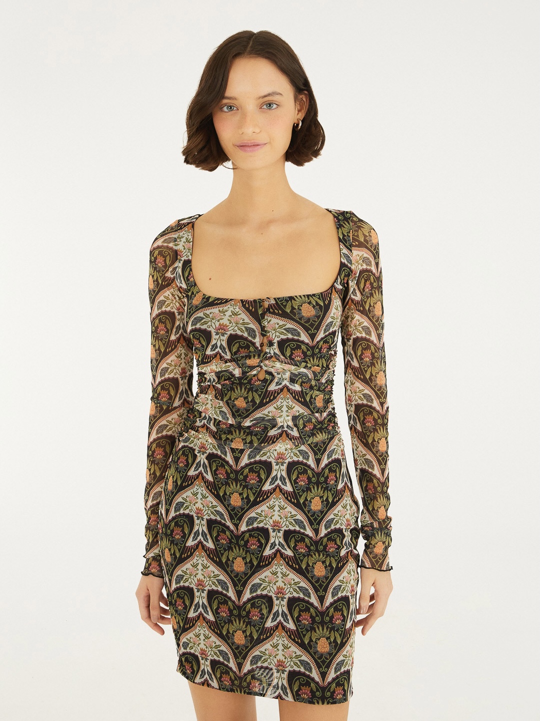 O Vestido Tule Andorinha da Farm possui mangas longas ajustadas e decote quadrado. A peça se destaca pela leveza do tecido em tule, garantindo fluidez e um caimento casual. A modelagem é ideal para ocasiões que pedem conforto e estilo, seja em um passeio ou em um evento especial. Esta é uma peça Farm Rio Original - Inverno 26!